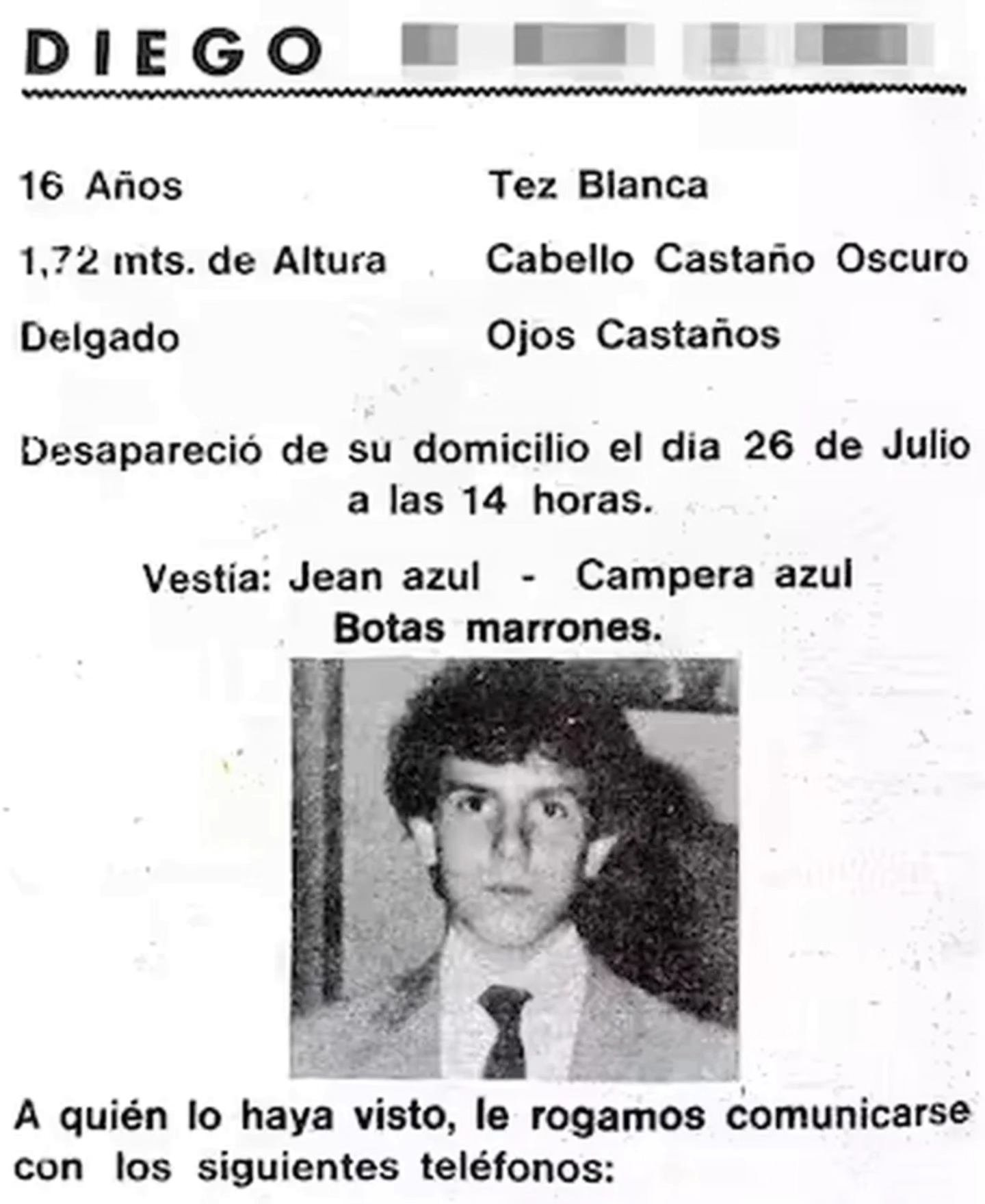 Se trata de Diego, un adolescente de 16 años que fue visto por última vez con vida el 26 de julio de ese año a las 14:00 y era buscado por sus seres queridos.