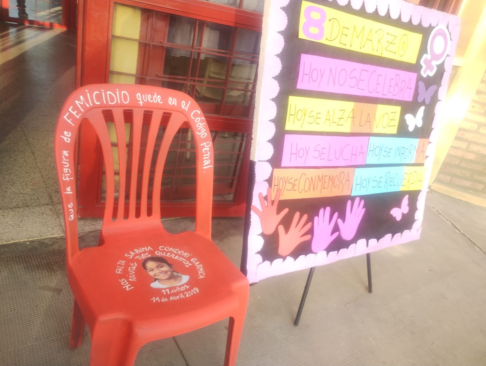 El homenaje se realizó en la escuela a la que asistía Sabina., durante la formación inicial. En la oportunidad la Secretaría hizo entrega a la institución educativa de una silla roja con la fecha del asesinato de la niña, frases reflexivas y un texto alusivo a la importancia de mantener la figura del femicidio en el código Penal, en referencia a la insistencia del gobierno Nacional de eliminar esta figura jurídica.