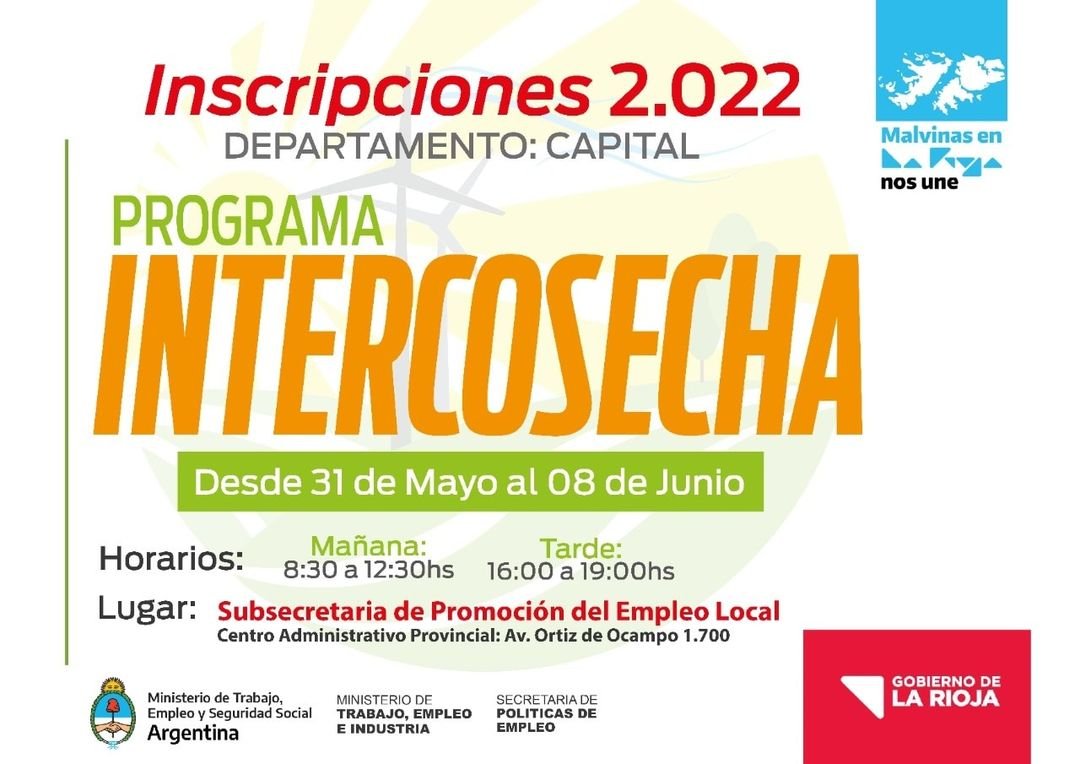 Beatriz Telle confirmó que las inscripciones para el programa intercosecha ya se encuentra habilitado desde el 31 de mayo hasta el 8 de junio para aquellas personas que estén interesadas. Los horarios disponibles para las inscripciones son de 8,30 de la mañana a las 12,30 del mediodía, y desde las 16,00 hasta las 19,00 de la tarde, en la Subsecretaria de Promoción de Empleo Local.