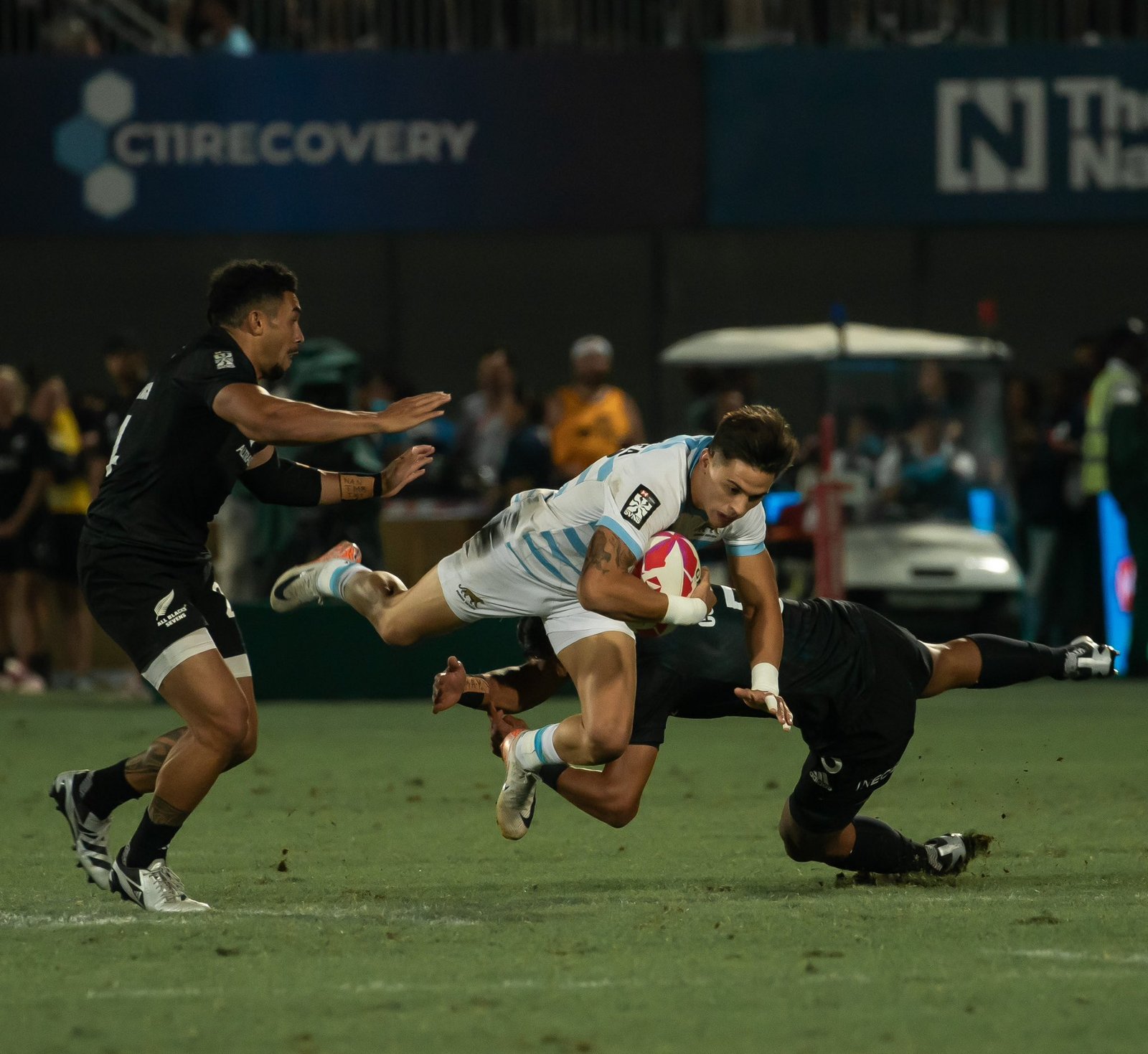 La primera anotación llegó tras una amarilla al equipo neozelandés, lo que permitió a Matías Osadczuk concretar un try, seguido de la conversión de Joaquín Pellandini.