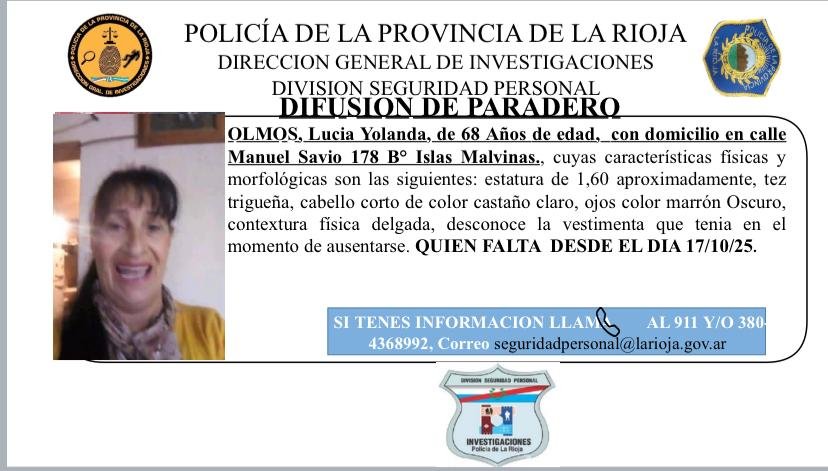 Se trata de Yolanda Olmos, del barrio Islas Malvinas, quien falta a su hogar desde el 17 de octubre pasado, sin regresar hasta el momento.
