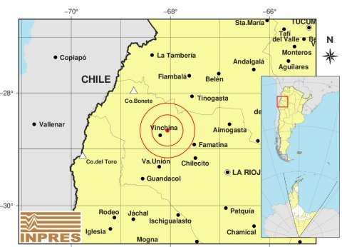 | Epicentro: | 144 km al NO de La Rioja; 228 km al O de San F. Del Valle De Catamarca; 16 km al NE de Vinchina -28.67 (lat) -68.06 (long) | |