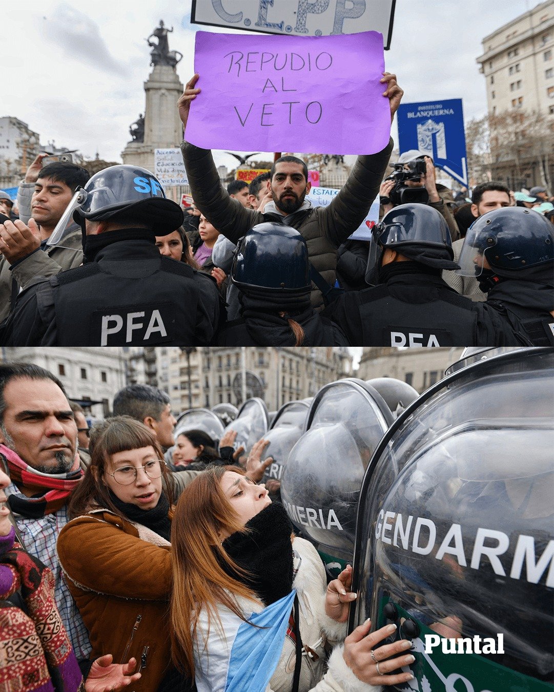 Mientras los manifestantes continuaban con su protesta en la plaza, llegaron varios camiones de la Policía Federal y móviles de Gendarmería. En cuestión de minutos, la presencia de uniformados duplicó a la de los manifestantes, generando un clima de tensión.